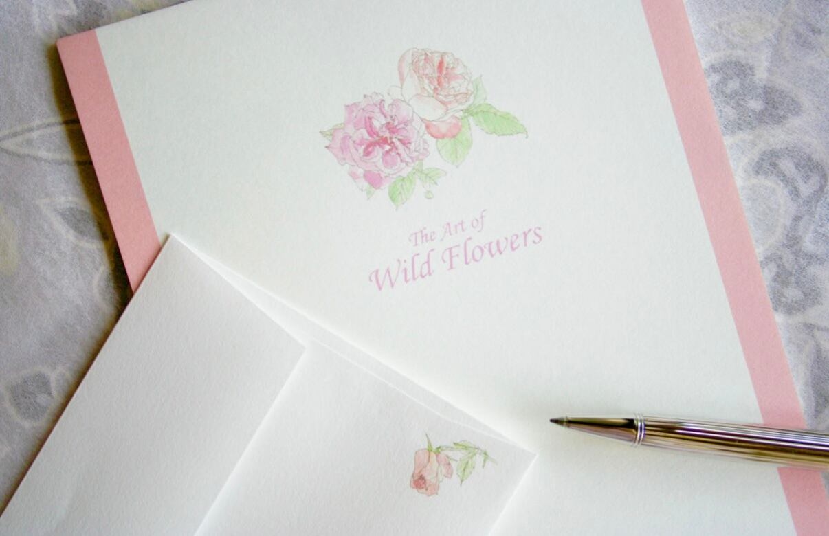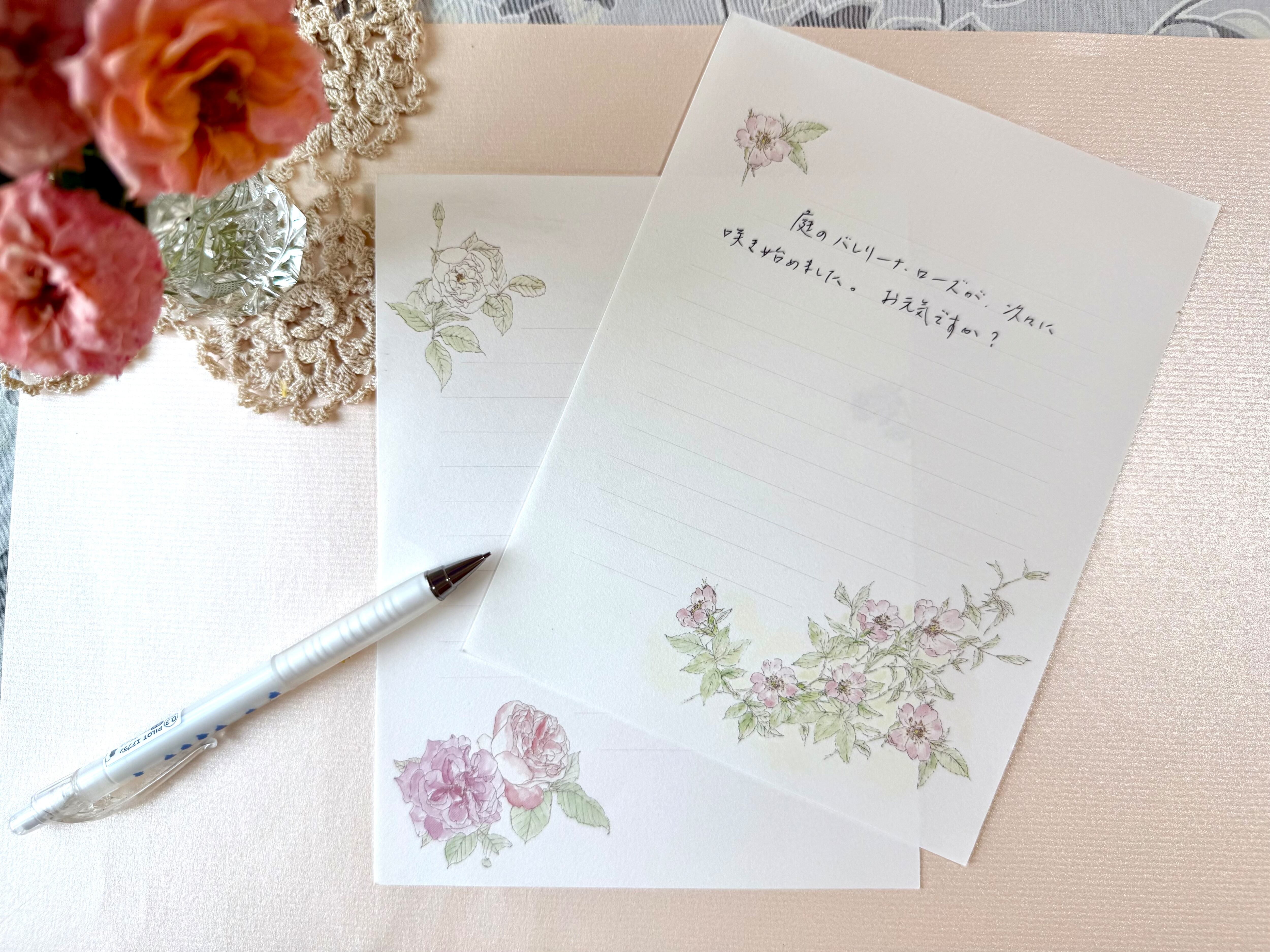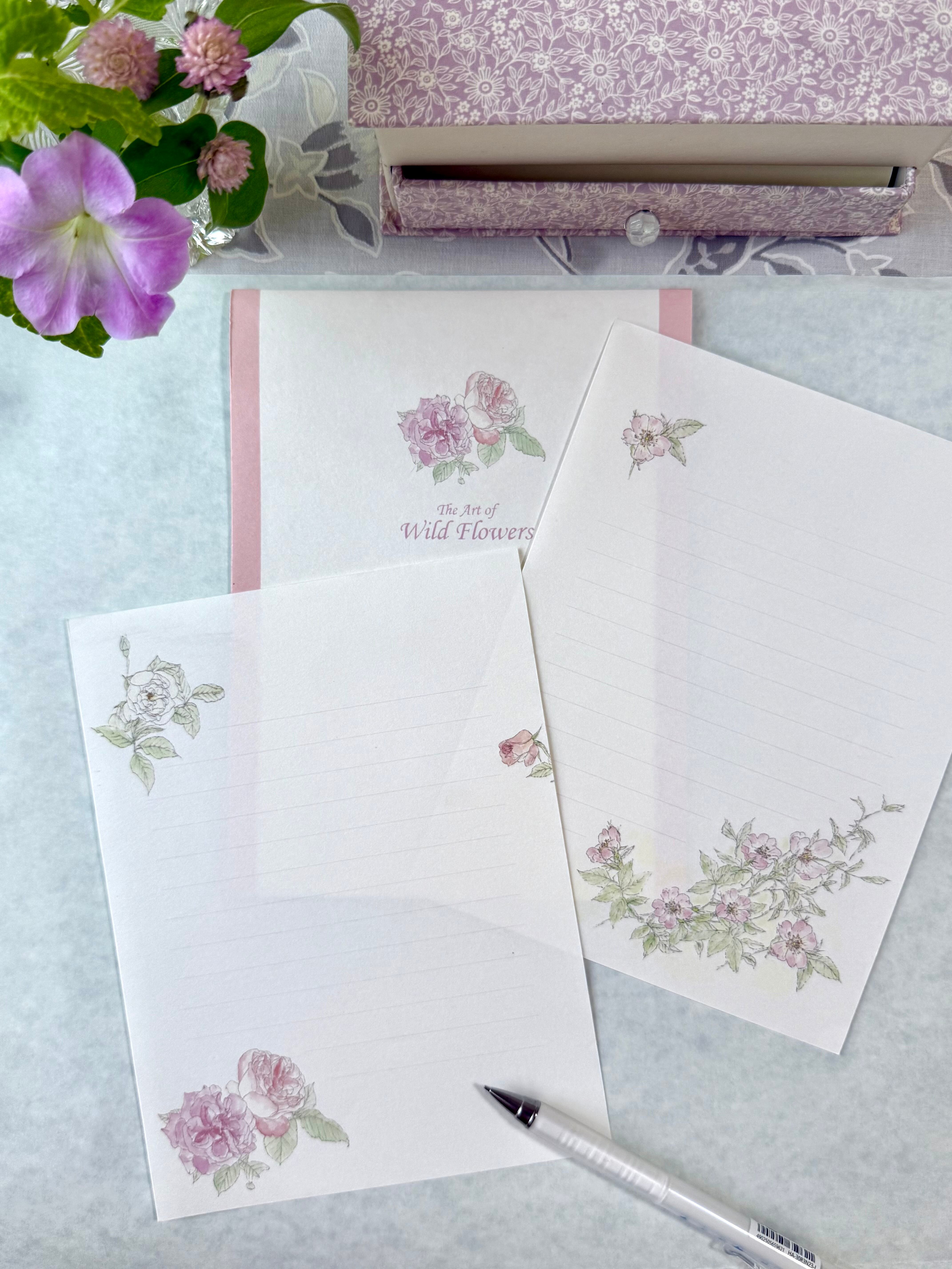 便箋・封筒は、それぞれ3種類(ピンク系「バラ」/ブルー系「風に揺れる花」/オレンジ系「ひだまり」)揃えています。