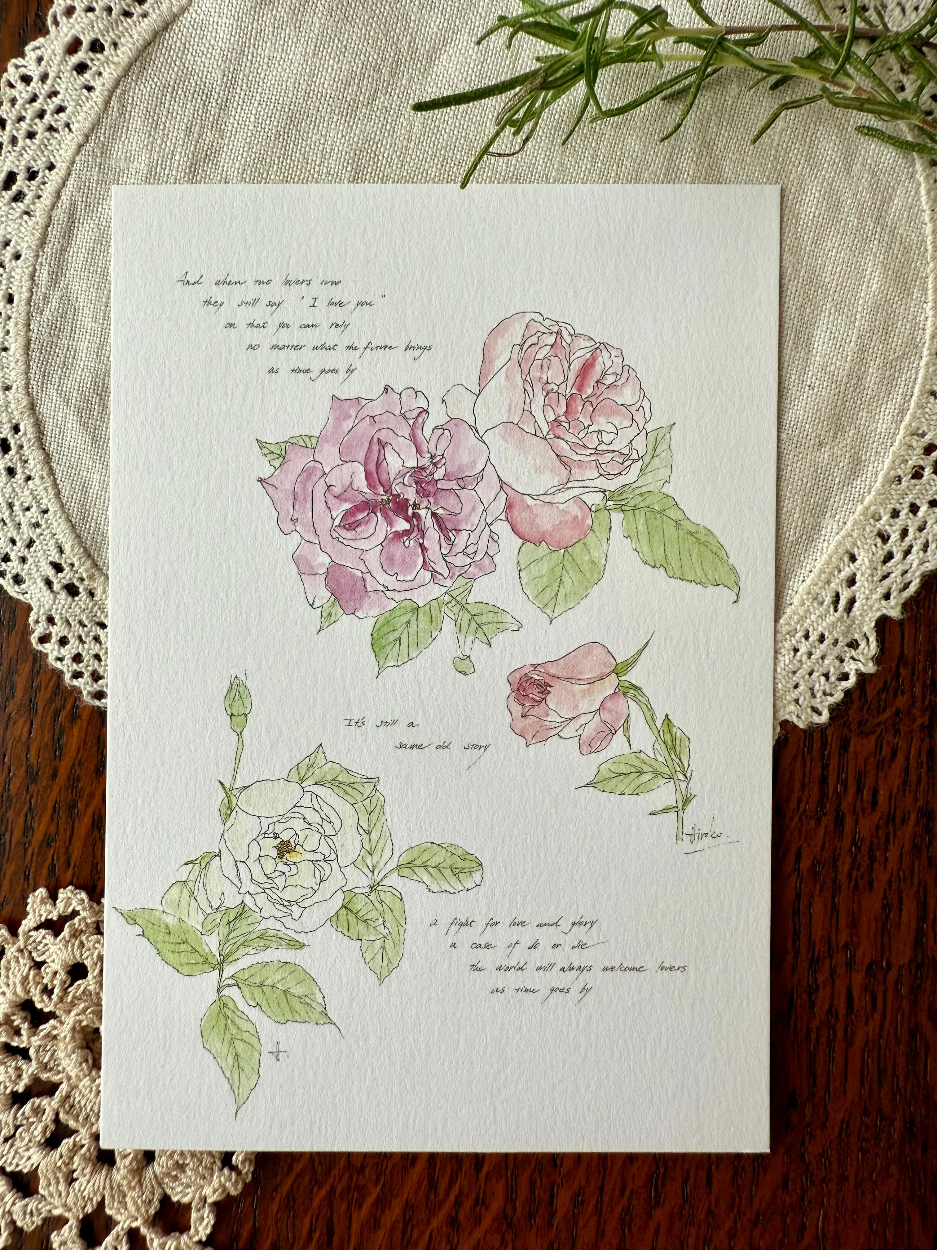 イギリスで、ターナーさんの庭に咲いていた、大輪のオールドローズを描いた一枚。