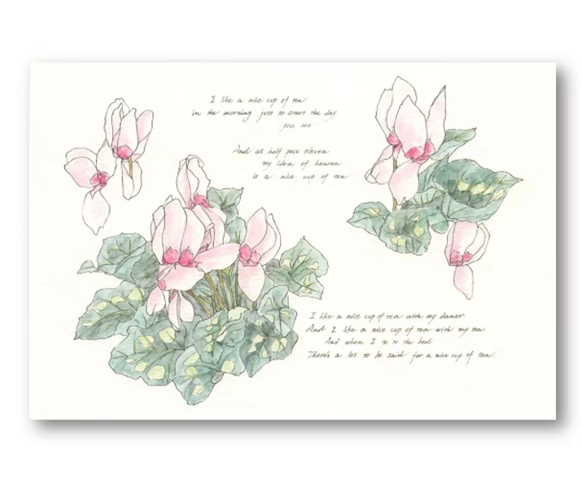 淡いピンクのシクラメンに、紅茶の詩を添えたポストカード。
