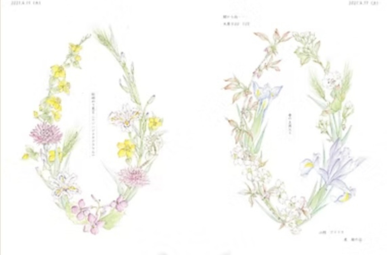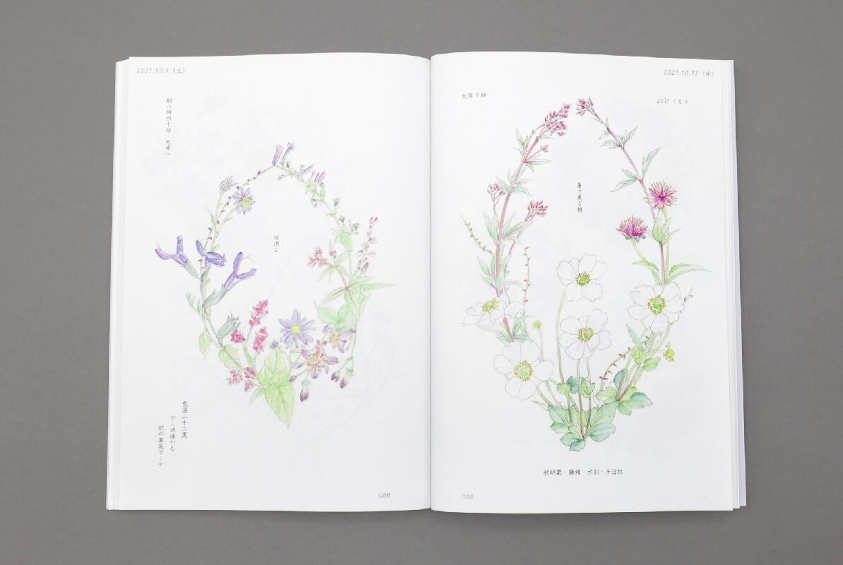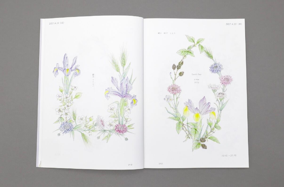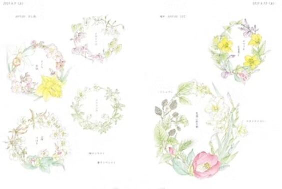 リース状に描かれた瑞々しい花の水彩画と、里山の暮らしを綴った日記が、四季の彩りと静かな時間を届けてくれます。