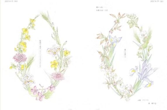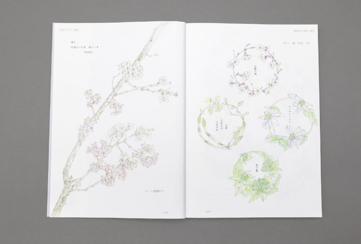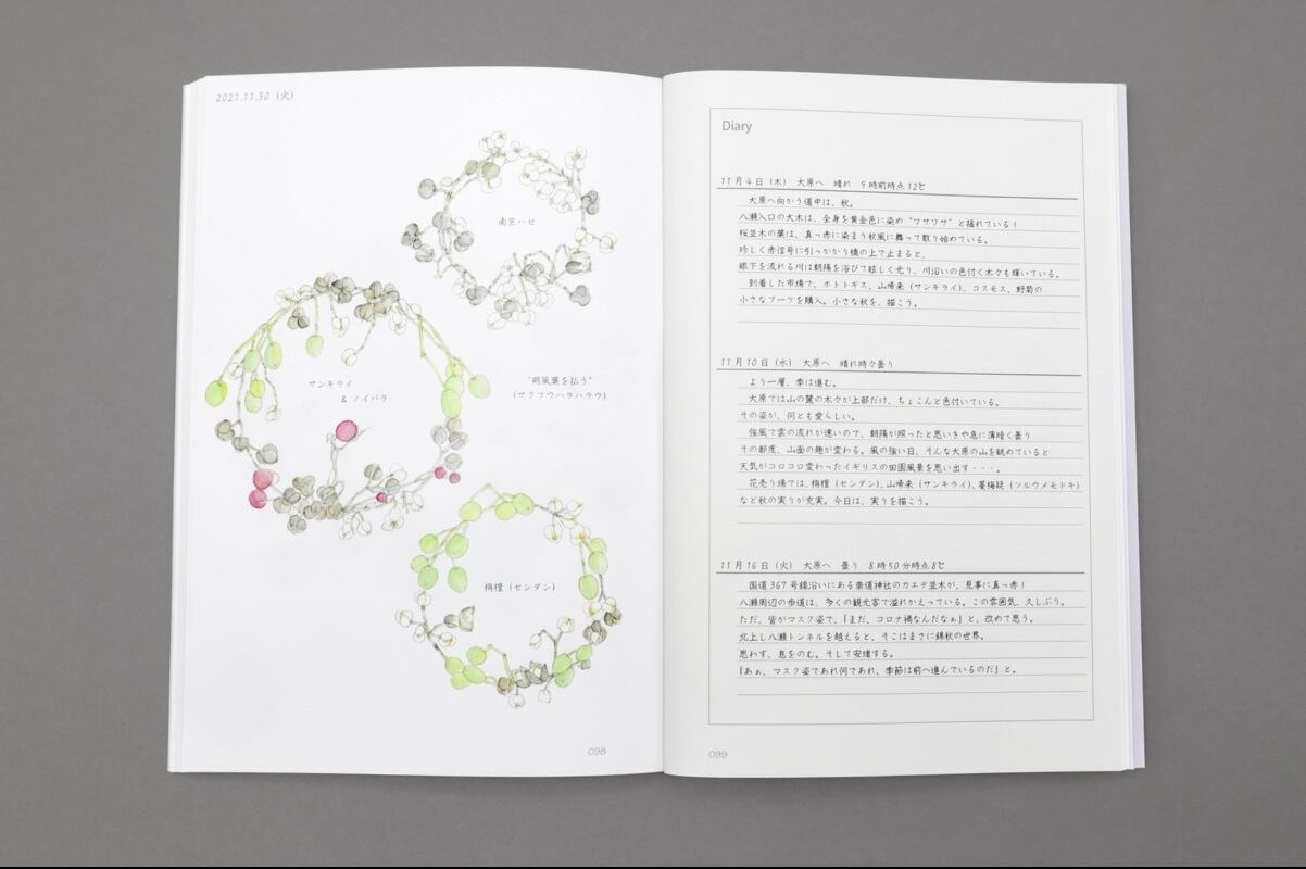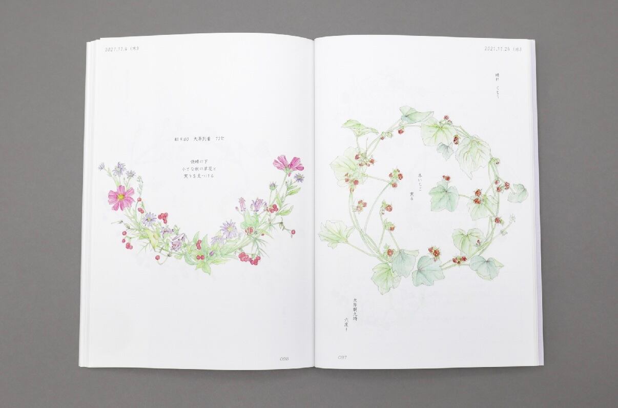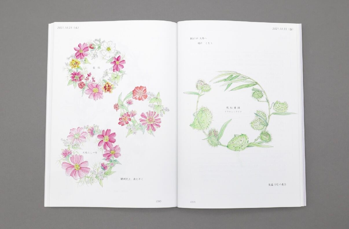 リース状に描かれた瑞々しい花の水彩画と、里山の暮らしを綴った日記が、四季の彩りと静かな時間を届けてくれます。