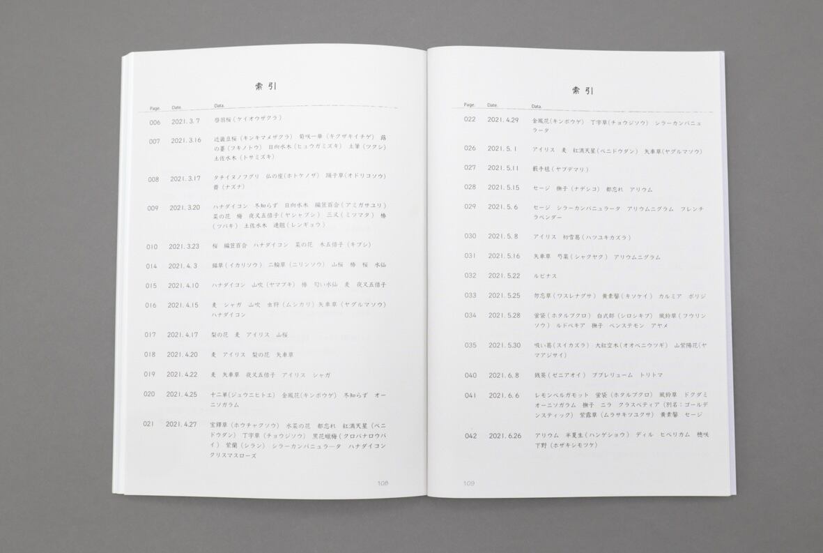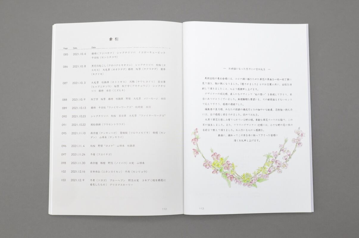 また、巻末の「索引」では、本書で描かれた草花のすべての名前と読み方を記載していますので、ページを捲りながらお楽しみ下さい。