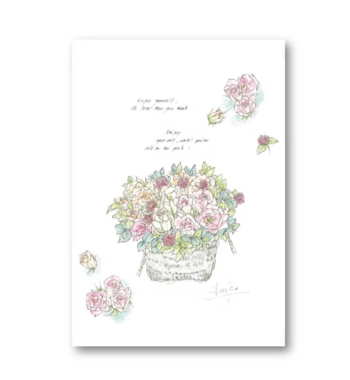 京都の花屋「プーゼ」のオリジナル籠アレンジメントをもとに描いた一枚。淡いピンク色の薔薇を基調に、やさしさと気品を併せ持つ花束です。