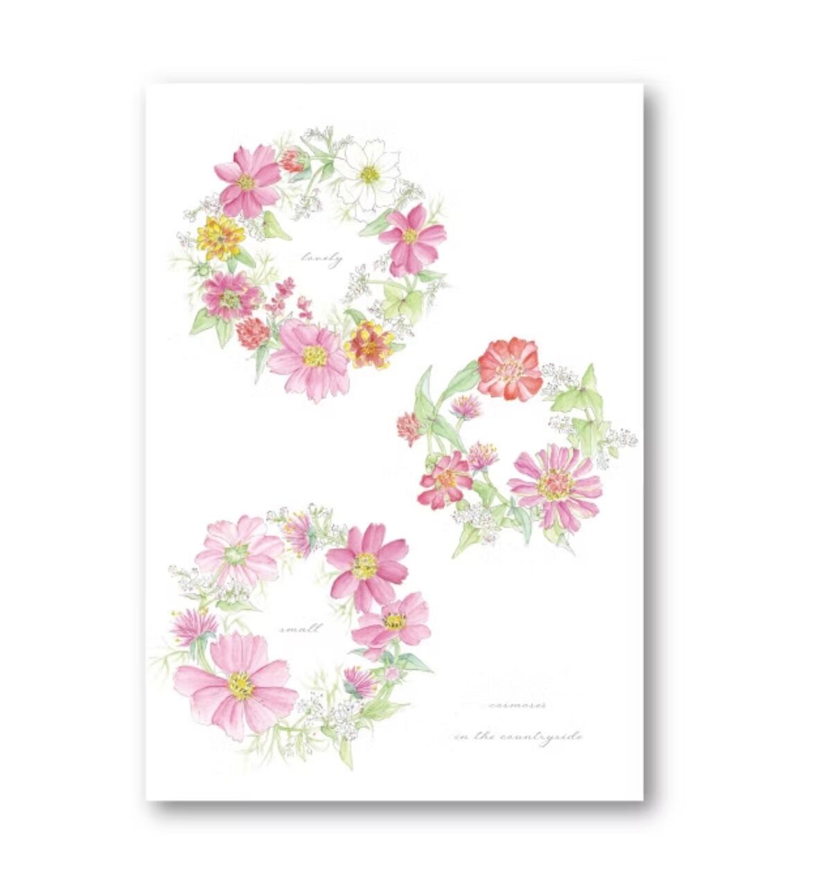 京都・大原の野に咲くピンクのコスモスを、小さなリース状に描いた一枚。